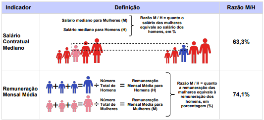 São apresentadas em % quanto a remuneração das mulheres vale em relação à dos homens. As situações positivas mostram valores maiores ou iguais a 100%.